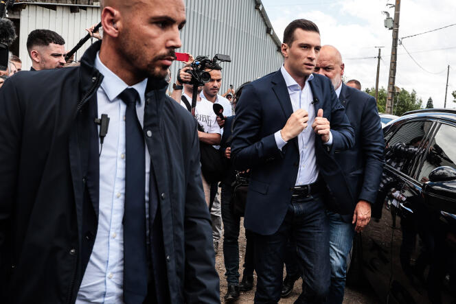 Jordan Bardella,à Chuelles (Loiret),le 14 juin 2024. CYRIL BITTON / DIVERGENCE POUR « LE MONDE » Police,justice,immigration : pour ces trois thèmes centraux dans la doctrine du Rassemblement national,Jordan Bardella,le président du parti d’extrême droite,est resté,lors de la présentation de son programme pour les élections législatives,sur les fondamentaux historiques de sa formation,mettant l’accent sur la « fermeté » et la répression.