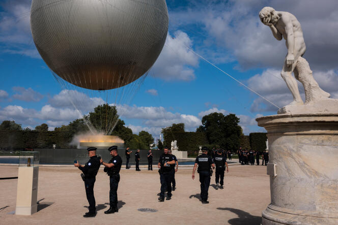 Des policiers français passent devant la vasque des Jeux olympiques et paralympiques attachée à un ballon transportant la flamme olympique dans le jardin des Tuileries à Paris,le 7 août 2024. JOEL SAGET / AFP Les deux écrans géants font vibrer le parvis de l’Hôtel de Ville de Paris,jeudi 8 août,en fin d’après-midi. L’un diffuse du basket masculin,l’autre du handball féminin – les deux équipes ont une chance d’envoyer la France en finale des Jeux olympiques (JO). Malgré la chaleur,plusieurs centaines de supporteurs sont déjà réunis sur la plus importante « zone de festivité » de la capitale,baptisée la « Terrasse des Jeux »,d’une capacité de 12 000 personnes.