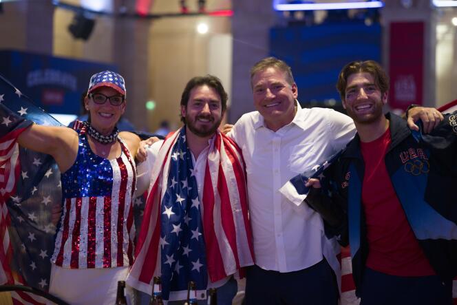 Une famille venue de San Francisco (Californie),dans la Team USA House,au sein du Palais Brongniart,à Paris,le 4 août. TERENCE BIKOUMOU POUR « LE MONDE » Pour rencontrer à coup sûr des Américains à Paris,direction la place de la Bourse. Au Palais Brongniart,la puissance américaine s’expose crânement,affichant sur la façade de ce temple néoclassique ses couleurs et son sigle « USA » en lettres gigantesques. N’entre pas qui veut : pour suivre les épreuves retransmises à l’intérieur,et peut-être rencontrer des athlètes,le tarif est astronomique : 325 euros par tête.