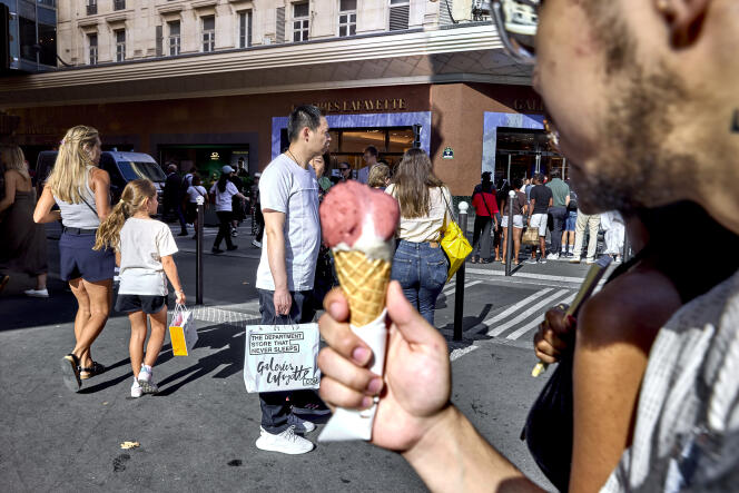 Près du Printemps et des Galeries Lafayette,à Paris,le 29 juillet 2024. BRUNO LEVY / DIVERGENCE POUR « LE MONDE » « On nous avait laissés espérer des chiffres d’affaires pouvant aller jusqu’à 40 % de plus qu’un été habituel grâce à un afflux massif de touristes. » Francis Palombi,président de la Confédération des commerçants de France,se souvient de ces discours optimistes sur les retombées économiques des Jeux olympiques (JO).