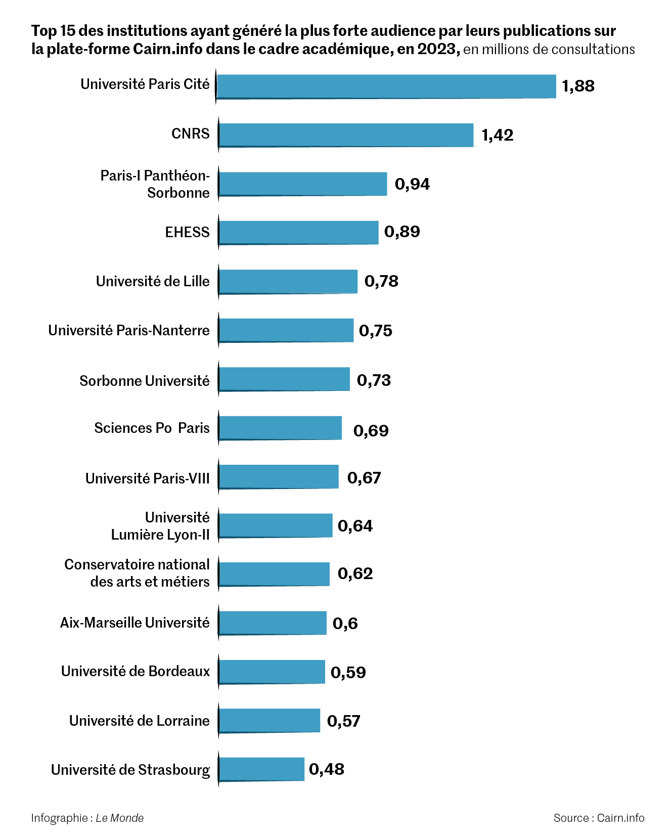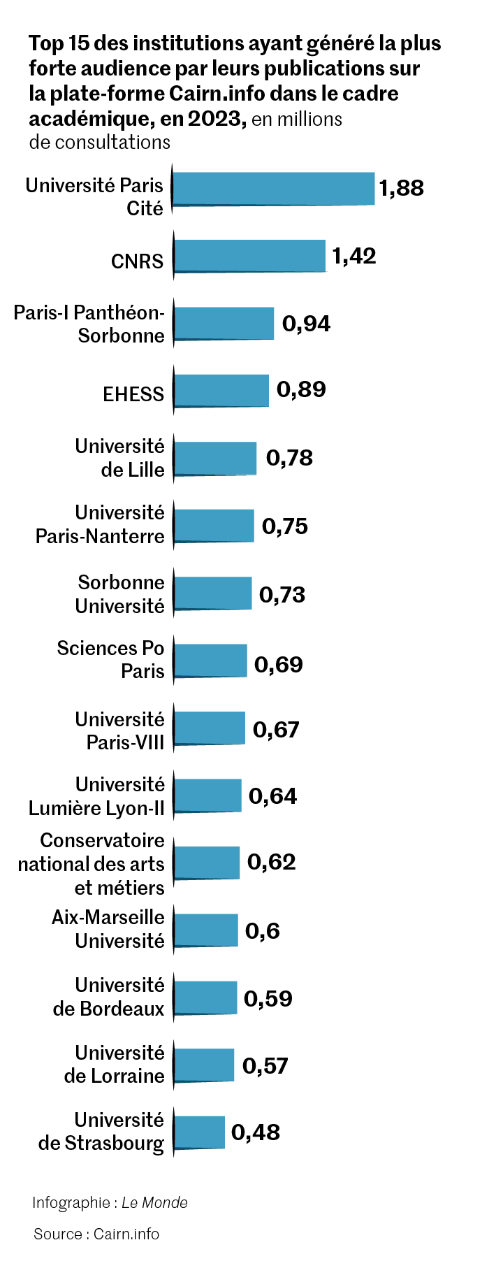 Dans ce classement,l’université Paris Cité arrive au premier rang,avec quelque 2 300 enseignants-chercheurs et chercheurs qui signent les articles les plus lus par leurs pairs (1,9 million de consultations en 2023). Suivent le CNRS (1,4 million de consultations,2 200 auteurs),l’université Paris-I Panthéon-Sorbonne (945 000 consultations,1 595 auteurs),l’Ecole des hautes études en sciences sociales (898 000 consultations,1 700 auteurs) et l’université de Lille (780 000 consultations,1 300 auteurs).