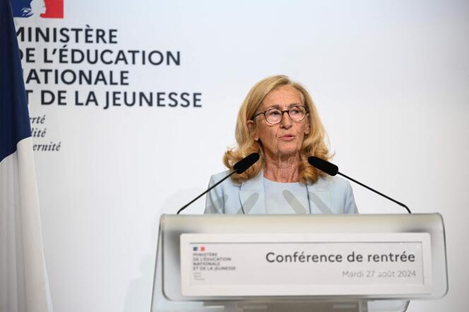 La ministre démissionnaire de l’éducation nationale,Nicole Belloubet,lors d’une conférence de presse,à Paris,le 27 août 2024. BERTRAND GUAY / AFP Les enseignants et les chefs d’établissement de collège accueilleront leurs élèves de 3e à partir du lundi 2 septembre sans pouvoir leur expliquer précisément selon quelles règles ils passeront le premier examen de leur scolarité. Invitée,lors de sa conférence de presse de rentrée,mardi 27 août,à apporter des précisions sur la réforme du brevet des collèges suspendue depuis la dissolution de l’Assemblée nationale,la ministre démissionnaire de l’éducation nationale,n’a pas apporté de réponse claire quant aux devenirs des changements annoncés.