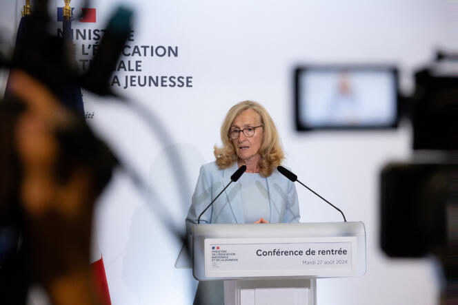 La ministre de l’éducation nationale démissionnaire,Nicole Belloubet,lors de sa conférence de presse de rentrée,à Paris,le 27 août 2024. BERZANE NASSER / ABACA « Les sonneries des salles de classe ne se calent pas sur celles du Palais-Bourbon. » Par ces mots,ministre de l’éducation nationale démissionnaire,« bien consciente » du contexte politique inédit dans lequel se déroule la rentrée scolaire,a défendu sa prise de parole lors de la conférence de presse de rentrée,mardi 27 août. Ce rituel de la vie de l’éducation nationale s’est transformé cette année en exercice d’équilibriste par lequel Nicole Belloubet a tenté de faire le point sur le devenir des réformes en cours et d’esquisser les chantiers qu’elle aurait aimé mener,avec une liberté de ton rare.