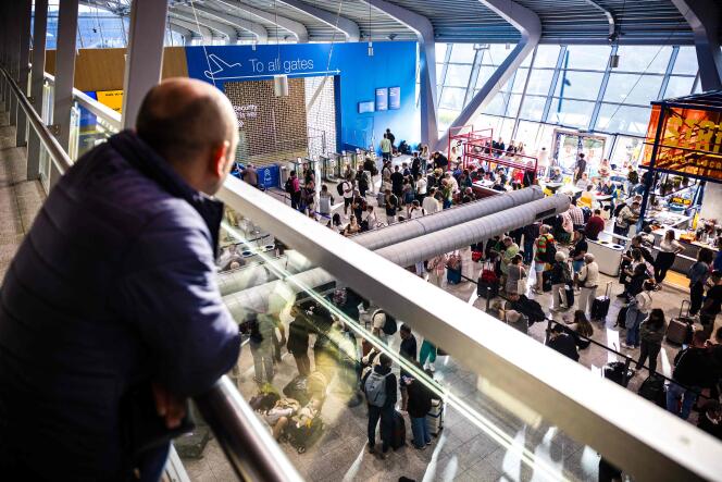Une panne informatique a touché l’aéroport régional et plusieurs services publics dont les garde-côtes et la police militaire aux Pays-Bas,à Eindhoven le 28 août 2024. ROB ENGELAAR / AFP Services gouvernementaux et municipaux,Chambre des députés,gendarmerie,gardes-côtes,centres de vaccination,avions cloués au sol durant plusieurs heures,jusque dans la soirée,à l’aéroport d’Eindhoven où des milliers de passagers étaient bloqués : les Pays-Bas ont connu une journée noire,mercredi 28 août,en raison d’une panne informatique qui a débuté dans la soirée de mardi et dont la cause n’est pas encore clairement identifiée. La police nationale a,elle,pu recourir à un plan B,impliquant l’usage de téléphones portables.