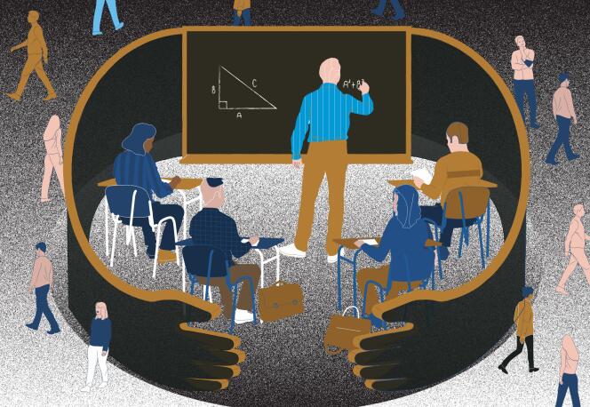 PALM ILLUSTRATIONS « Vous vous souvenez de la définition du théorème de Pythagore,qu’on a vu la semaine dernière ? »,demande avec assurance Nicolas Dhooge à sa classe de 4e fictive,en dessinant une figure géométrique au tableau. « Dans un triangle rectangle,le carré de la longueur de l’hypoténuse est égal à la somme des carrés des longueurs des deux autres côtés »,répond du tac au tac un participant,installé au premier rang. Un « fayot ! »,puis des rires fusent dans la grande salle du lycée d’Alembert,à Aubervilliers (Seine-Saint-Denis),où 70 élèves un peu particuliers sont réunis cet après-midi-là. L’âge moyen est d’environ 33 ans. Et Nicolas répète devant les autres,sous le regard attentif d’une formatrice du Choix de l’école,les « gestes de l’enseignant »,dans le cadre du campus d’été de cette association.
