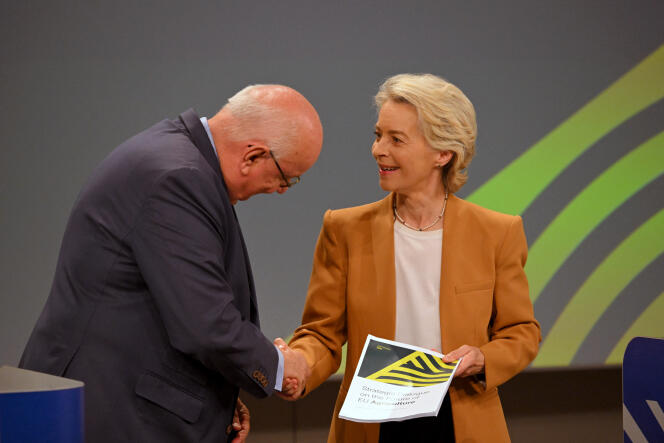 L’universitaire allemand Peter Strohschneider et la présidente de la Commission européenne,à Bruxelles,mercredi 4 septembre 2024. NICOLAS TUCAT / AFP Ursula von der Leyen l’a répété,mercredi 4 septembre : dans les cent premiers jours de son second mandat,qui devrait commencer au plus tôt le 1er novembre,la présidente de la Commission européenne présentera « une vision,une feuille de route pour l’agriculture ». Il faut,a-t-elle expliqué,« protéger la nature »,tout en « assurant des revenus suffisants aux agriculteurs »,auxquels elle promet d’alléger la charge bureaucratique.