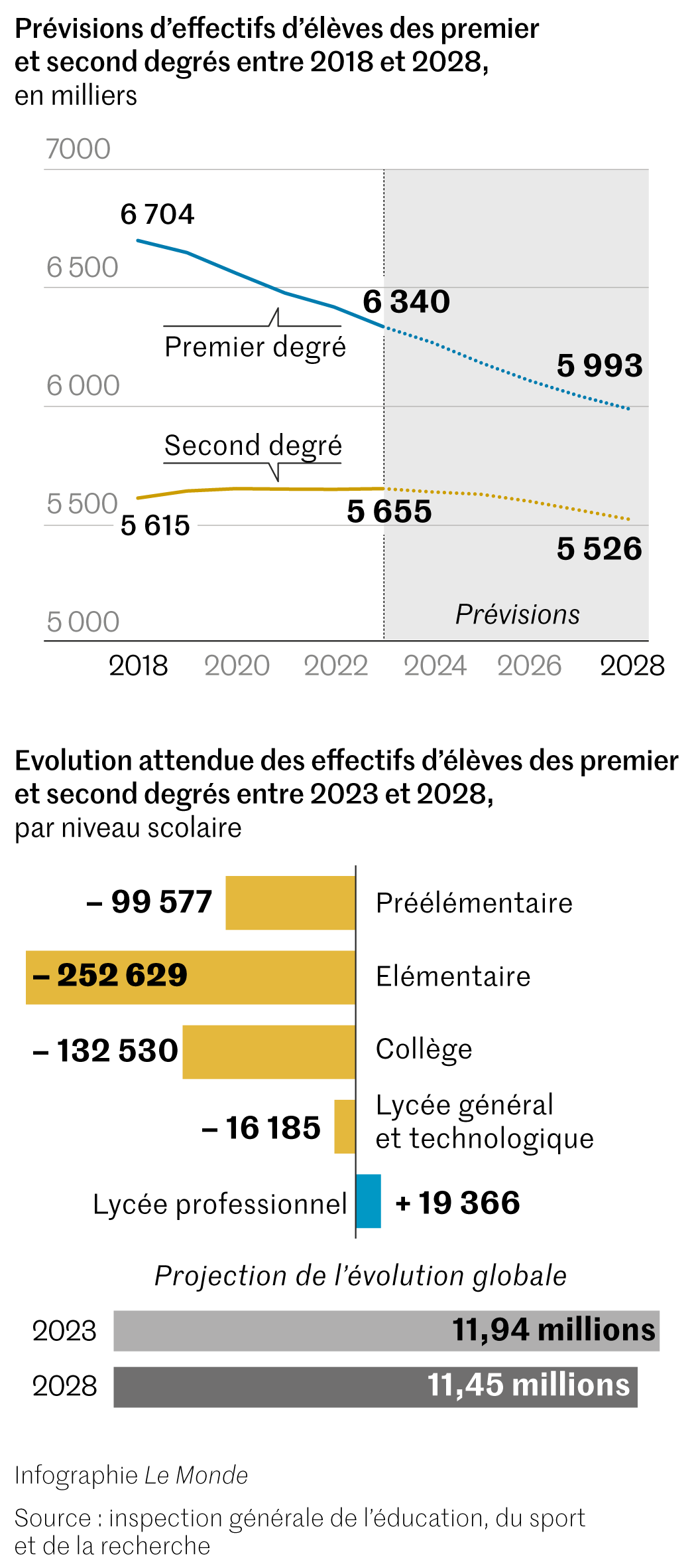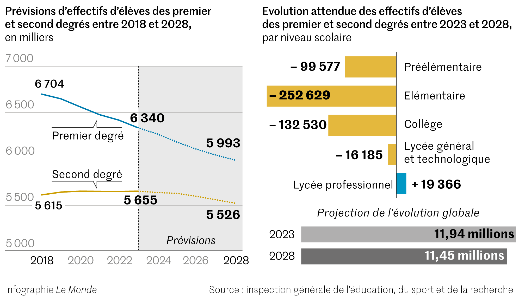 Dans le même temps,on compte 404 000 élèves de moins dans le primaire en 2023 par rapport à 2017,tandis que ce nombre a augmenté respectivement de 54 000 dans le second degré et de 245 000 dans l’enseignement supérieur. La baisse du nombre d’élèves commence néanmoins à atteindre le collège. Entre 2023 et 2028,les effectifs scolaires devraient encore diminuer de plus de 480 000 élèves,dont 252 000 à l’école élémentaire et 132 500 au collège,selon les projections de ce rapport.A travers trois scénarios,les auteurs du rapport soumettent « des pistes de travail » à confronter avec « les réalités de terrain » pour aboutir à des « optimisations ». La première modélisation consiste à identifier au sein des établissements scolaires des classes à effectifs trop réduits par rapport à la moyenne nationale établie par niveau et par type d’établissement (éducation prioritaire ou non par exemple) et à répartir les élèves dans d’autres classes. Cette « rationalisation » permettrait de fermer 600 classes à l’école primaire,entre 1 000 et 1 450 classes au collège,et de supprimer entre 1 380 et 1 820 équivalents temps plein. Ces économies se traduiraient pour les lycées concernés,« soit par une réduction de l’offre d’options ou d’enseignements de spécialité,soit par une réduction des dédoublements de classe »,conclut le rapport.