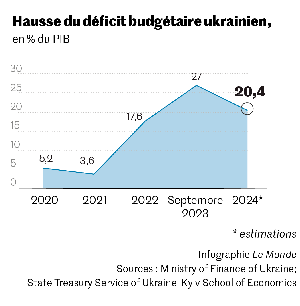 Avec l’intensification des frappes russes sur les infrastructures énergétiques,la croissance du PIB ukrainien ne devrait pas dépasser les 3,5 %,contre 5,3 % en 2023. Le déficit budgétaire devrait continuer de se creuser à 43 milliards de dollars (38,8 millions d’euros). Celui-ci est passé de 3,6 % du PIB en 2021 à 27 % en 2023. Le pays dépend désormais de l’aide étrangère pour près de la moitié de son budget.