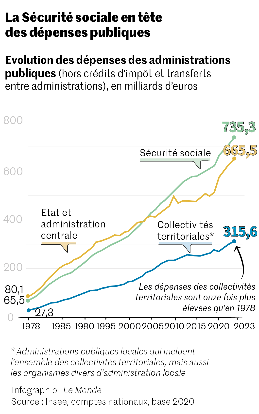 Les collectivités locales ne représentent que 18 % des 1 608 milliards d’euros dépensés par les administrations publiques en 2023,selon l’Institut national de la statistique et des études économiques (Insee) : 43 % l’ont été au titre de la Sécurité sociale,et 39 % par l’Etat. Pour les collectivités,cela représente 316 milliards d’euros (avant consolidation comptable) : 250 milliards d’euros de fonctionnement,66 milliards d’investissements. C’est à peu près 4 700 euros par Français.
