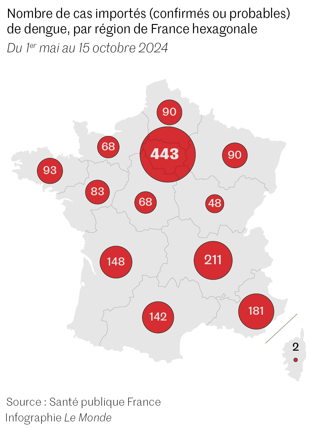 Le nombre de cas autochtones de dengue en France explose les compteurs. Depuis le 1er mai,début de l’activité des moustiques-tigres,78 personnes ont contracté la maladie tropicale,sans pour autant avoir voyagé dans un pays où la maladie est endémique,selon un bulletin de Santé publique France publié mercredi 16 octobre. Ils ont été simplement contaminés par la piqûre d’un moustique local,qui avait auparavant choisi de faire son repas de sang sur une personne rapportant la maladie d’un voyage aux Antilles françaises ou à l’étranger. La maladie peut provoquer une forte fièvre,souvent accompagnée de maux de tête,de nausées et de vomissements,pendant deux à trois semaines. Elle n’est mortelle que dans de rares cas. Mais une deuxième infection augmente le risque de dengue sévère.