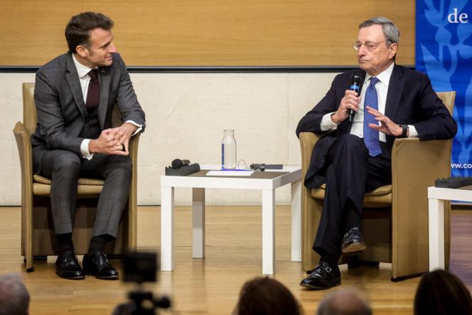 L’ancien Premier ministre italien et ancien président de la Banque centrale européenne Mario Draghi (à droite) à côté du président de la République,Emmanuel Macron (à gauche),lors d’une table ronde sur « L’avenir de la compétitivité européenne »,au Collège de France,à Paris,le 13 novembre 2024. TERESA SUAREZ / AFP La salle était debout et visiblement enthousiaste. L’amphithéâtre Marguerite-de-Navarre du Collège de France était plein à craquer pour écouter le président de la République,Emmanuel Macron,échanger avec l’ancien président de la Banque centrale européenne Mario Draghi,mercredi 13 novembre. Le professeur d’économie au Collège,Philippe Aghion,les avait réunis pour disserter sur un sujet pourtant peu enthousiasmant,le décrochage européen par rapport à l’Amérique,thème du rapport rédigé par M. Draghi pour la Commission européenne.