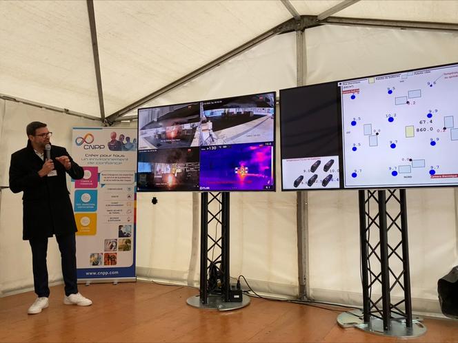 Retransmission du test d’incendie et disposition des capteurs (à droite),dans le site du Centre national de prévention et de protection,à Saint-Marcel (Eure),le 12 novembre 2024. CNPP En quelques minutes,la température de l’une des 40 batteries pour vélo électrique stockées sur une palette,dans un hangar de 270 mètres carrés,monte à 800 degrés. Le carton prend feu,les flammes montent vite vers le plafond,les explosions se succèdent et projettent des braises vers d’autres palettes entreposées à quelques mètres.