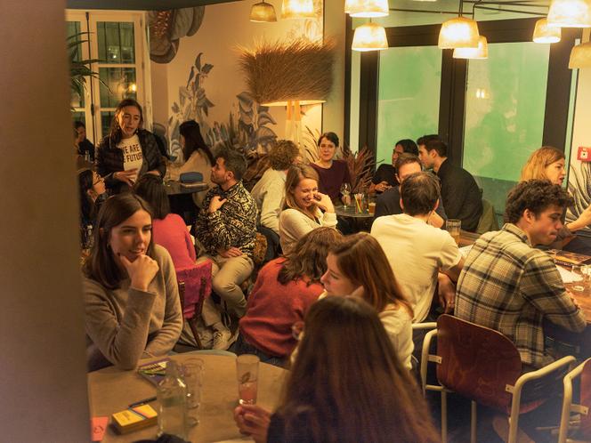 Aux soirées du Offline Club,les portables (éteints) sont laissés à l’entrée. Ici,au Griffon,un bar du Marais,à Paris,le 5 novembre. ARTHUR MERCIER POUR M LE MAGAZINE DU MONDE Une grande boîte métallique est posée à l’entrée du café-bar Griffon,dans le Marais,à Paris. A l’intérieur,soixante cases alignées fermant à clé. En arrivant,les clients y glissent leur téléphone avec entrain. C’est précisément pour cela qu’ils ont payé 9,50 euros : passer deux heures en bonne compagnie,sans aucun smartphone ni écran. Le 5 novembre,la première soirée du Offline Club en France a affiché complet.