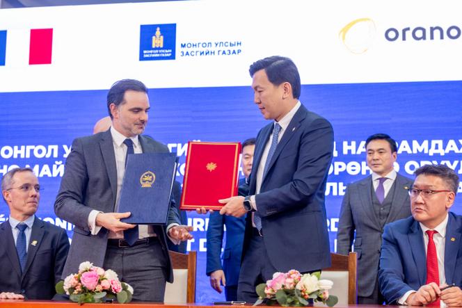 Le ministre français délégué au commerce extérieur,Laurent Saint-Martin (deuxième à gauche),et le ministre de la Mongolie,Uchral Nyam-Osor,lors de la signature de l’accord avec Orano,à Oulan-Bator,le 17 janvier 2025. BYAMBASUREN BYAMBA-OCHIR/AFP Emmanuel Macron s’était rendu en Mongolie au mois de mai 2023,une première pour un chef d’Etat français. Puis son homologue mongol,Ukhnaagiin Khürelsükh,lui avait rendu visite à Paris,en octobre 2023 puis juillet 2024. Vendredi 17 janvier,le groupe public français Orano (anciennement Areva) a conclu un accord avec l’entreprise mongole MonAtom pour exploiter un vaste gisement d’uranium dans le sud de ce pays enclavé entre Chine et Russie – la production est attendue au plus tôt pour 2028.
