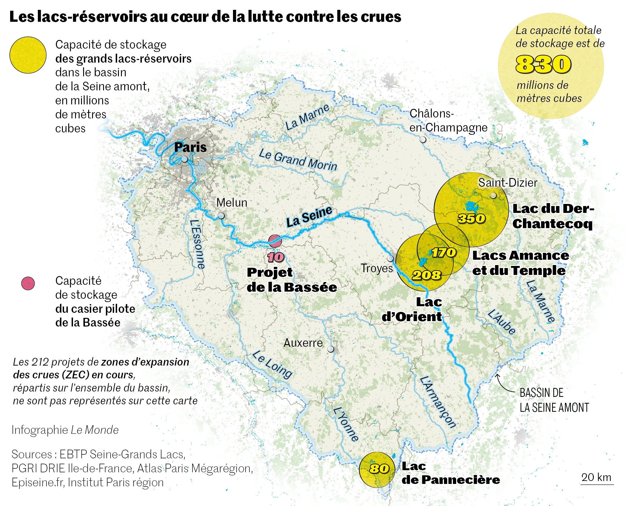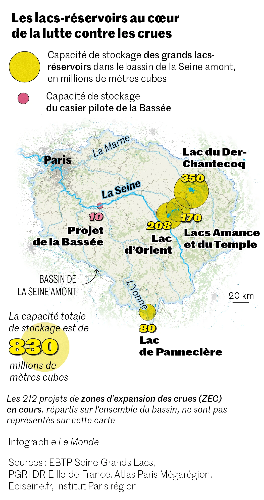 Deux ans et demi de travaux,bien plus de débats,114 millions d’euros. C’est le cinquième ouvrage au compteur,tous gérés par l’Etablissement public territorial de bassin Seine grands lacs. « Et le premier équipement lourd construit depuis 1990 »,insiste Patrick Ollier,président de l’établissement public et de la Métropole du Grand Paris (123 communes),territoire particulièrement vulnérable. Les quatre autres sont les lacs réservoirs posés au XXe siècle sur le fleuve et ses affluents. Leur mission est double : écrêter les crues (jusqu’à 70 centimètres en moins dans Paris),mais aussi assurer un débit constant en période sèche. Sans les lacs,la navigation sur la Seine certains étés,comme le refroidissement de la centrale nucléaire de Nogent,ou la production d’eau potable,serait compromise.