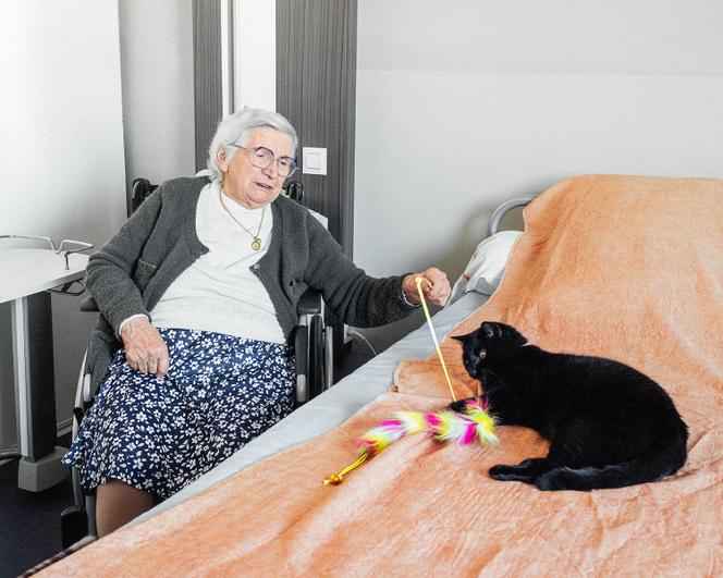 Grisette passe deux heures chaque après-midi avec Raymonde Dasque. Le matin,pendant que la nonagénaire reçoit toilette et soins,la chatte est prise en charge par l’équipe de l’Ehpanimal,une nouvelle unité de 70 mètres carrés installée au sein même de l’Ehpad libournais. Cette structure,inaugurée le 3 décembre 2024,financée par le laboratoire pharmaceutique vétérinaire Ceva Santé animale,l’un des poids lourds français du secteur,et un spécialiste des infrastructures informatiques sécurisées,Cheops Technology,est une première en France. Les deux entreprises ont ainsi investi à parts égales 390 000 euros pour couvrir les frais de construction et de fonctionnement de l’Ehpanimal sur trois ans.