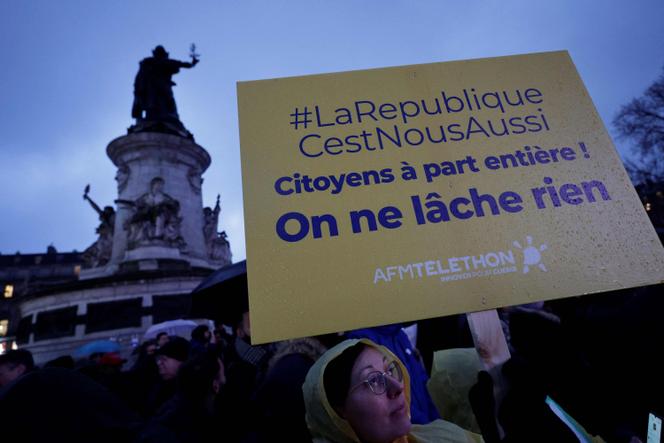 Lors du rassemblement organisé par le Collectif Handicaps,à Paris,le 10 février 2025. STEPHANE DE SAKUTIN / AFP « La République,c’est nous aussi »,scandaient sous la pluie plusieurs centaines de personnes,dont beaucoup en fauteuil,avec des cannes ou des chiens guides,lundi 10 février au soir,place de la République à Paris. Le rassemblement,organisé par le Collectif Handicaps,marquait les 20 ans de la loi du 11 février 2005 sur l’égalité des droits et des chances,la participation et la citoyenneté des personnes handicapées,qui concerne « douze millions de personnes et neuf millions d’aidants » en France.