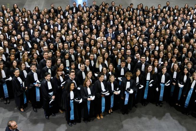 Emmanuel Macron et Eric Dupond-Moretti,alors ministre de la justice,avec les élèves de la promotion de l’Ecole nationale de la magistrature,au palais des congrès,à Bordeaux,le 9 février 2024. LUDOVIC MARIN / AFP Tous ont acheté leur robe noire de magistrat,impatients de la porter,enfin. Lundi 17 février,les 355 élèves de la dernière promotion de l’Ecole nationale de la magistrature (ENM),effectuent leur rentrée. En plein centre-ville,juste à côté du tribunal,les nouveaux entrants peuvent mesurer leur chance d’intégrer cette prestigieuse institution. Pousser les portes de l’ENM n’est pas donné à tout le monde : sur les quelque 3 000 candidats chaque année,seuls 10 % décrochent le sésame.