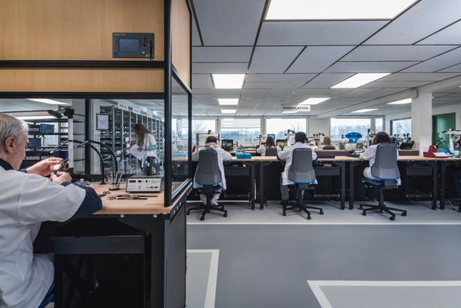 En revanche,dans l’atelier de production d’Ernolsheim-lès-Saverne (Bas-Rhin) vu de l’intérieur,la mue a eu lieu. Aux côtés des opératrices et opérateurs,toujours penchés sur les longues tables d’assemblage,les machines,autrefois inexistantes,font leur apparition. D’un côté,un énorme robot qui permet de graver,en quelques minutes,la marque ou un logo sur les boîtiers ; là,un engin avale à un rythme de métronome les cadrans pour y poser automatiquement les minuscules aiguilles…
