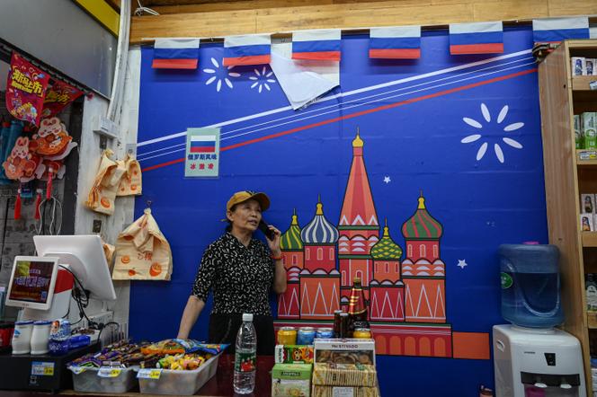 Dans un magasin de produits russes,à Pékin,le 16 mai 2024. JADE GAO / AFP C’est un large chapiteau démontable installé depuis janvier sur le parvis du Modern Plaza,centre commercial légèrement désuet à l’ouest de la capitale chinoise. Les baies vitrées sont recouvertes d’un adhésif aux couleurs du drapeau russe. On y lit : « Pavillon des produits russes,commerce mutuel sino-russe »,comme s’il s’agissait d’une initiative de l’ambassade russe à Pékin.