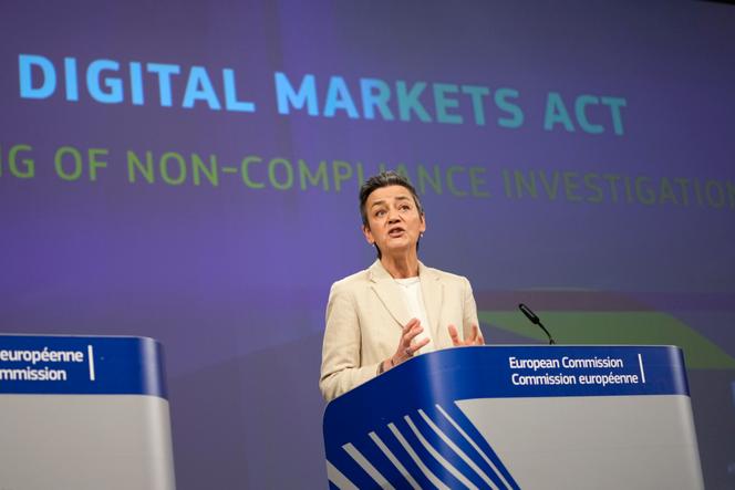 Margrethe Vestager,alors commissaire européenne chargée de l’Europe adaptée à l’ère numérique,lors d’une conférence de presse sur le règlement Digital Markets Act,au siège de la Commission européenne,à Bruxelles,le 25 mars 2024. VIRGINIA MAYO / AP La Commission européenne cherche à montrer qu’elle continue à appliquer sa réglementation sur le numérique,malgré les tensions avec l’administration du président américain,Donald Trump. Mercredi 19 mars,l’exécutif de Bruxelles a publié ses conclusions « préliminaires » jugeant que deux services d’Alphabet enfreignent le règlement sur la concurrence sur les plateformes en ligne,le Digital Markets Act (DMA),entré en vigueur en mars 2024 : le moteur de recherche Google Search et le magasin d’applications Google Play. La Commission a aussi publié des « recommandations » sur la façon dont Apple devrait appliquer les obligations d’interopérabilité du texte,notamment pour ouvrir davantage ses iPhone aux objets connectés fabriqués par des concurrents.