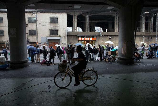 Un homme passe en vélo devant des personnes sans abri faisant la queue pour accéder à un refuge dans le quartier défavorisé de Kamagasaki à Osaka (Japon),le 23 avril 2016. CARL COURT / GETTY IMAGES / AFP A Osaka,c’est une page d’histoire qui va se tourner. Le quartier de Kamagasaki,au sud de la grande ville portuaire,qui abrita longtemps le plus grand marché de main-d’œuvre journalière du pays,est en effet condamné à disparaître. Appelé également « le quartier de l’amour et de la pitié »,Kamagasaki est une zone de grande misère où survivent des journaliers trop vieux pour être embauchés,d’autres sans-abri venus d’ailleurs et des paumés en tout genre : surtout des hommes et quelques femmes jetés là par le ressac de la vie dont bien rares sont ceux et celles qui en repartiront.
