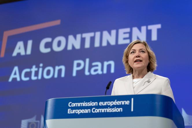 Henna Virkkunen,commissaire européenne chargée de la souveraineté technologique,à Bruxelles,le 9 avril 2025. OMAR HAVANA / AP Faire de l’Union européenne (UE) le « continent de l’intelligence artificielle (IA) ». L’ambition peut paraître démesurée tant le Vieux Continent est à la traîne en la matière par rapport aux Etats-Unis ou à la Chine. Mais la Commission l’assume et a présenté son plan pour y parvenir,mercredi 9 avril,à l’heure où les Bourses plongeaient,dans la foulée de l’introduction des nouveaux droits de douane américains. Il y a d’autant plus urgence que la guerre commerciale déclenchée par Donald Trump pourrait,dans une escalade malheureuse,mettre en difficulté des entreprises européennes qui sont largement dépendantes des technologies américaines.