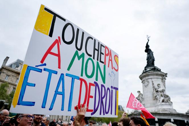 A Paris,le 12 avril 2025. STEPHANIE LECOCQ / REUTERS Quelques drapeaux,des applaudissements timides et une foule dispersée,samedi 12 avril. Sur la petite scène disposée à deux pas de la statue de la République,un large message est inscrit noir sur blanc : « Menacer l’Etat de droit,c’est menacer la démocratie. » Pourtant,la place de la République,à Paris,peine à se remplir.