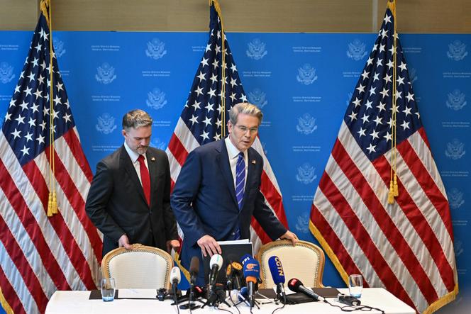 Le secrétaire américain au Trésor,Scott Bessent (à droite),et le représentant américain au commerce,Jamieson Greer,lors d’une conférence de presse,à Genève (Suisse),le 12 mai 2025. FABRICE COFFRINI/AFP A l’issue de deux jours de discussions à Genève (Suisse),samedi 10 et dimanche 11 mai,les deux premières puissances de la planète ont annoncé,lundi 12 mai,renoncer à l’essentiel des droits de douane qui,depuis presque un mois,bloquaient les échanges commerciaux entre elles. Dans un communiqué commun publié lundi à 15 heures,heure de Pékin,3 heures du matin,heure de Washington,les deux capitales ont officialisé un accord suspendant la majeure partie des droits de douane punitifs pour quatre-vingt-dix jours.