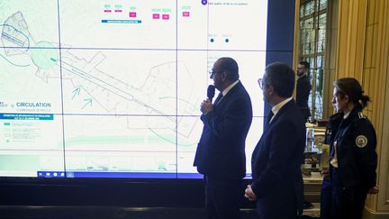 Le préfet de police Laurent Nunez,le ministre de l'Intérieur Gérald Darmanin et la cheffe de la DGSI Céline Berthon,à la présentation des mesures de sécurité pour le Nouvel An,à la Préfecture de Police le 29 décembre 2023. (STEPHANE DE SAKUTIN / AFP)