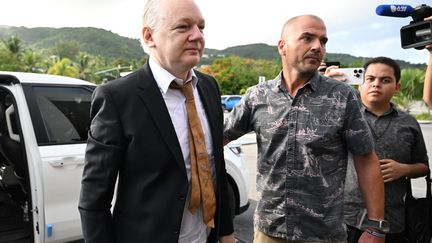 Julian Assange à son arrivée à un tribunal de Saipan,le 26 juin 2024 aux îles Mariannes du Nord. (YUICHI YAMAZAKI / AFP)