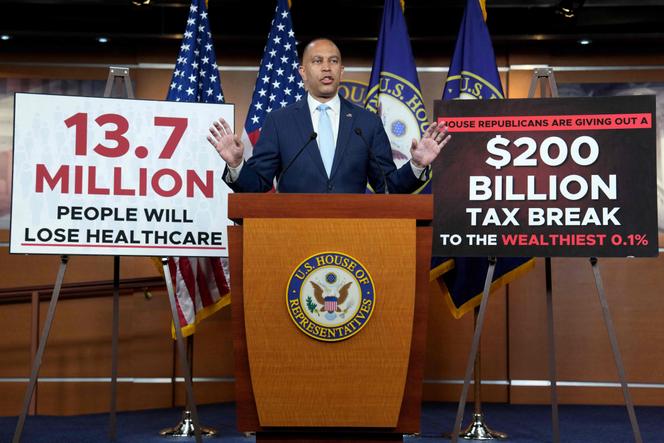 Le chef des démocrates à la Chambre des représentants,Hakeem Jeffries,lors d’une conférence de presse au Capitole,à Washington,le 13 mai 2025. KEVIN DIETSCH / AFP L’équation est complexe et les républicains s’échinent,depuis plusieurs jours,à la résoudre. Comment gagner quelques centaines de milliards de dollars aux dépens d’un dispositif auquel Donald Trump a promis,à de multiples reprises,de ne pas toucher ? Le programme Medicaid,qui permet à quelque 70 millions de personnes issues de foyers à faibles revenus,dont 40 % d’enfants,de bénéficier d’une couverture de santé,est au cœur des discussions sur le texte budgétaire,baptisé par le président des Etats-Unis « big,beautiful bill » (le « grand et beau projet de loi »).