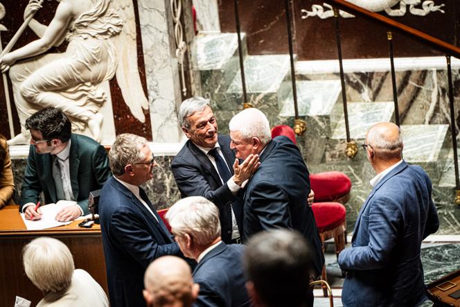 Le député MoDem Philippe Vigier salue le rapporteur général,Olivier Falorni,à l’issue du vote sur la proposition de loi relative au droit à l’aide à mourir,à l’Assemblée nationale,le 27 mai 2025. JULIEN MUGUET POUR « LE MONDE » Généralement,les votes à l’Assemblée nationale s’accompagnent d’un brouhaha ambiant. Les chefs de file crient les consignes de vote pendant que certains députés s’empressent de regagner leur siège à la va-vite. Mais,ce mardi 27 mai,le vote solennel sur la fin de vie n’était pas un vote comme les autres.